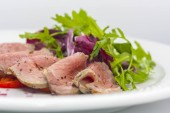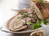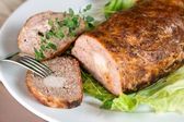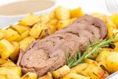 pieczona wołowina i Yorkshire pudding z pieczoną zieloną fasolą na białym tle