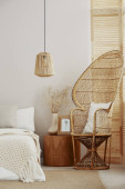 Zdjęcie "Czarno-biała pościel na wygodnym łóżku king size w eleganckiej sypialni wnętrze z Pawłem krzesło i miejsce kopiowania na pustej ścianie" może być wykorzystywane do celów osobistych i komercyjnych zgodnie z warunkami zakupionej licencji Royalty-free. Obraz jest dostępny do pobrania w jakości wysokiej rozdzielczości do 5760x3840.