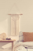 Czarno-biała pościel na wygodnym łóżku king size w eleganckiej sypialni wnętrze z Pawłem krzesło i miejsce kopiowania na pustej ścianie