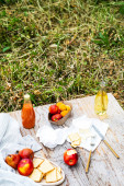 Jabłka, ciasteczka, butelka białego wina, Kanapki, kapelusz i okulary przeciwsłoneczne na kocu. Koncepcja piknikowa na zielonej trawie