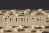 selektywne skupienie przyjemności napis na kostki otoczony bloków z literami na powierzchni drewnianej izolowane na czarno