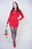 dość Asian Chubby kobieta pozowanie w czerwonej dzianiny sukienka i czarne modne rajstopy na białym studio tło