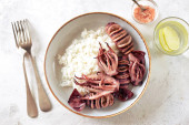 czarny risotto z krewetek i chorizo... Styl rustykalny.