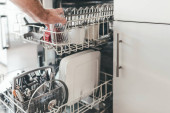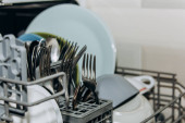 Zdjęcie "Kobiece ręka kładzie naczynia w otwartej zmywarce zbliżenie zatkane czystą, umyte naczynia. suche sztućce zbliżenie. widelce łyżki. kubki, talerze. Sprzęt AGD w kuchni" może być wykorzystywane do celów osobistych i komercyjnych zgodnie z warunkami zakupionej licencji Royalty-free. Obraz jest dostępny do pobrania w jakości wysokiej rozdzielczości do 5760x3840.