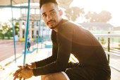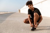 Przystojny młody African silny sportowy mężczyzna słuchanie muzyki z słuchawki na dworze.