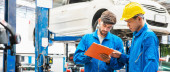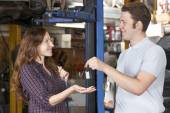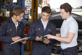 Portret Apprentice mechanik trzyma schowek praca w aut