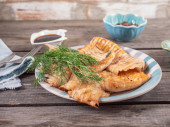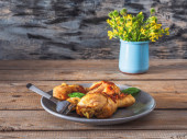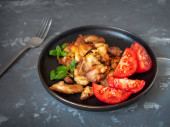 Apetyczne śniadanie z stek z kurczaka i smażone ziemniaki, gałązka świeżej pietruszki