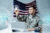 przystojny żołnierz w mundurze wskazując palcem na kłódki w biurze