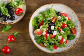 Zielona sałatka z pokrukowanym awokado, pomidorami wiśniowym, czarnymi oliwkami i serem. Zdrowa dieta wegetariańska letnia Sałatka warzywna. Ustawienie tabeli. Koncepcja żywności. Widok z góry.