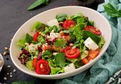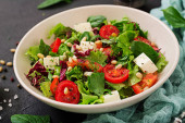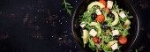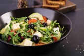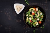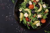 Zdjęcie "Zielona sałatka z pokrukowanym awokado, pomidorami wiśniowym, czarnymi oliwkami i serem. Zdrowa dieta wegetariańska letnia Sałatka warzywna. Ustawienie tabeli. Koncepcja żywności. Widok z góry." może być wykorzystywane do celów osobistych i komercyjnych zgodnie z warunkami zakupionej licencji Royalty-free. Obraz jest dostępny do pobrania w jakości wysokiej rozdzielczości do 5760x3840.
