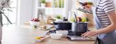 Młoda kobieta używa tabletu do gotowania w kuchni