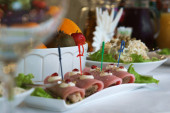 smaczne przekąski z kiełbasą na szaszłyki niebieski