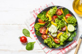 Zdjęcie "Widok z góry Sałatka warzywa świeże." może być wykorzystywane do celów osobistych i komercyjnych zgodnie z warunkami zakupionej licencji Royalty-free. Obraz jest dostępny do pobrania w jakości wysokiej rozdzielczości do 5760x3840.