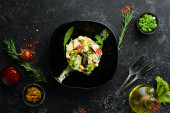 Sałatka warzywna z tuńczyka i jaj przepiórczych. Widok z góry. Wolne miejsce na tekst.
