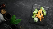 Kamienie i liście cynku z kroplami wody. Tło spa z akcesoriami spa na ciemnym tle. Widok góry. Wolne miejsce na tekst.