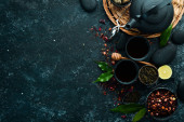 Zdjęcie "Kamienie i liście cynku z kroplami wody. Tło spa z akcesoriami spa na ciemnym tle. Widok góry. Wolne miejsce na tekst." może być wykorzystywane do celów osobistych i komercyjnych zgodnie z warunkami zakupionej licencji Royalty-free. Obraz jest dostępny do pobrania w jakości wysokiej rozdzielczości do 5760x3840.