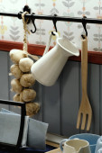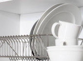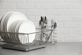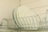 Białe naczynia suszenie na metalowym stojaku na naczynia. Stojak na dania do suszenia