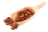 Stos suszonych fasoli Pinto i drewnianą łyżką na białym tle
