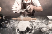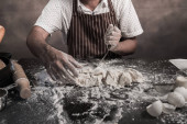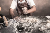 Człowiek, przygotowanie bułki przy stole w piekarni