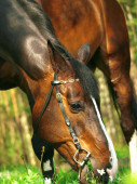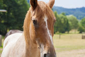 Pastwisku brązowy warmblood koń na wsi