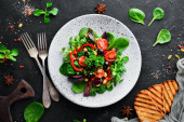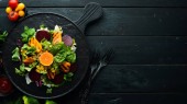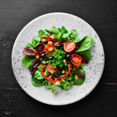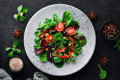 Zdjęcie "Sałatka warzywna ze szpinakiem, pomidorami, papryki i nasion dyni w płytce na drewnianym tle widok z góry. Wolne miejsce na tekst. Płaski lay" może być wykorzystywane do celów osobistych i komercyjnych zgodnie z warunkami zakupionej licencji Royalty-free. Obraz jest dostępny do pobrania w jakości wysokiej rozdzielczości do 5760x3840.