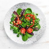 Sałatka warzywna ze szpinakiem, pomidorami, papryki i nasion dyni w płytce na drewnianym tle widok z góry. Wolne miejsce na tekst. Płaski lay