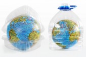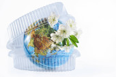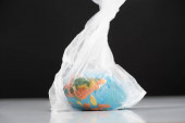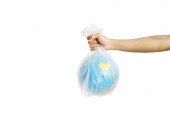 Ludzka ręka w plastikowej rękawiczce i planecie Ziemia w plastikowej torbie. Pojęcie zanieczyszczenia przez zanieczyszczenia z tworzyw sztucznych. Izolowane białe tło.