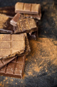 Złamana czekolada ułożone na czarnym tle. Czekolada bar piec