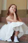 portret ładny uśmiechający się dziewczynki z długimi włosami w pięknej sukni siedzi na kroki na zewnątrz