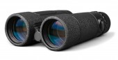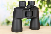 czarny nowoczesny lornetki na drewnianym stole na zielonym tle
