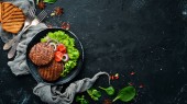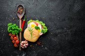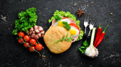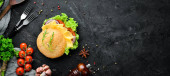 Burger z serem, pomidorami i cebulą. Śniadanie. Widok z góry. Wolne miejsce na tekst.