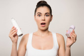 atrakcyjna kobieta patrząc na pojemnik z kosmetycznym śmietaną i trzymając butelkę balsamu do ciała na szaro
