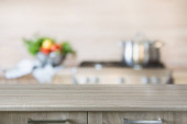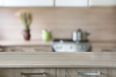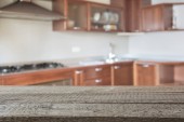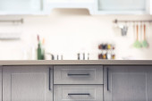 Zdjęcie "Niewyraźne tło. Nowoczesna kuchnia z blatem i miejsca do wyświetlania produktów." może być wykorzystywane do celów osobistych i komercyjnych zgodnie z warunkami zakupionej licencji Royalty-free. Obraz jest dostępny do pobrania w jakości wysokiej rozdzielczości do 5760x3840.