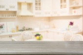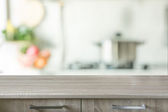 Niewyraźne tło. Nowoczesna kuchnia z blatem i miejsca do wyświetlania produktów.