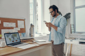 Pisanie wiadomości biznesowej. Młody nowoczesny biznesmen za pomocą inteligentnego telefonu siedząc w biurze