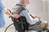 Doktor trzymający ręce z wesołym i niepełnosprawnym starszym mężczyzną na wózku
