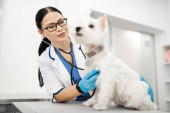Lekarz weterynarii w rękawiczkach starannie wykonaniem wstrzyknięcia dla białego psa
