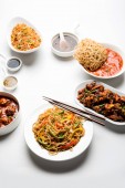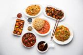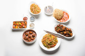 Widok z góry chiński zabrać jedzenie z pałeczki posiekać na drewnianym stole. Pikantne Azjatyckie jedzenie w białym pudełku-Sałatka, Souse, ryż z jajkiem, sucha wołowina, chrupiące kurczaka gotowane w oleju.