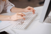 Bliska kobieta wpisując na klawiaturze siedząc przy stole
