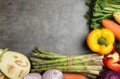 Płaska kompozycja z świeżymi dojrzałymi warzywami i owocami na białym tle