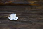 Porcelanowa filiżanka z talerz i złotą łyżeczką na serwetce jutowej. Zestaw do kawy Vintage na drewnianym stole.