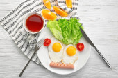 kiełbaski w formie serca, jajecznica i pietruszka, płyta kolor, na tle drewniane