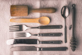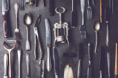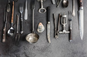 Zabytkowe naczynia na ciemnym teksturowanym tle, widok z góry