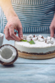Surowe ciasto kokosowe ozdobione białym miąższu i mięty. Zdrowy, świeży, Wegański deser. Bezglutenowe i bezcukrowe jedzenie