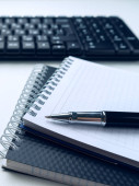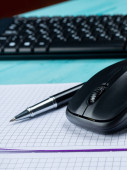 Zdjęcie "Biały drewniany stół z pióra, myszy, notebook. Miejsce w przestrzeni roboczej." może być wykorzystywane do celów osobistych i komercyjnych zgodnie z warunkami zakupionej licencji Royalty-free. Obraz jest dostępny do pobrania w jakości wysokiej rozdzielczości do 5760x3840.