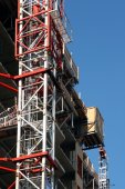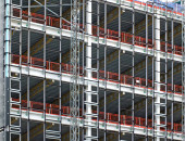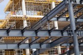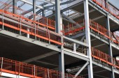 stalowa konstrukcja w budowie z Dźwigi i pomarańczowe szyny bezpieczeństwa