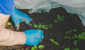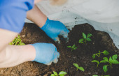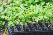 pracownik z sadzonkami pieprzu wiosną. Skupienie selektywne.