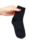 Ręka z czarną bawełnianą skarpetkę, Odzież do stóp.