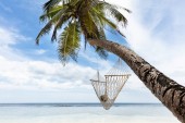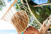 Zbliżenie młodej kobiety relaksującej się na hamaku nad piaszczystą plażą