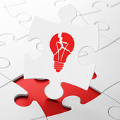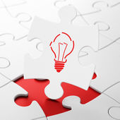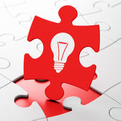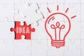 Widok z góry ramki białych puzzli układanki wokół żarówki napis na pomarańczowo